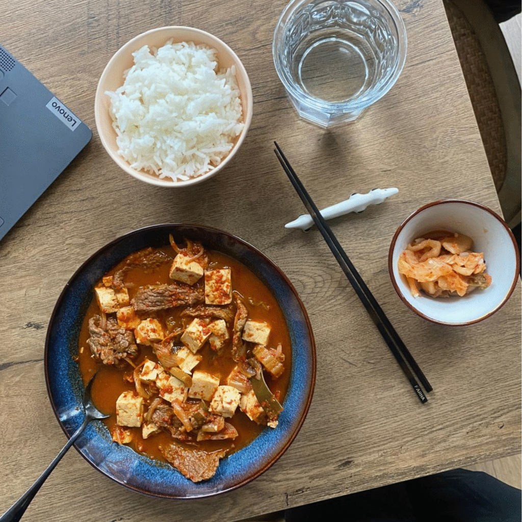 Review: A recipe I make at least once a month because I love me a Korean stew. Now, I make a lot of adjustments to this recipe (pork > beef, anchovy stock > dashi, replace mushrooms with extra tofu) and as you can see, it does not look like the pictures from the original recipe. It is still damn good! This recipe feeds me for 4 days and I serve with a small bowl of rice and Kimchi. I simply love this recipe.